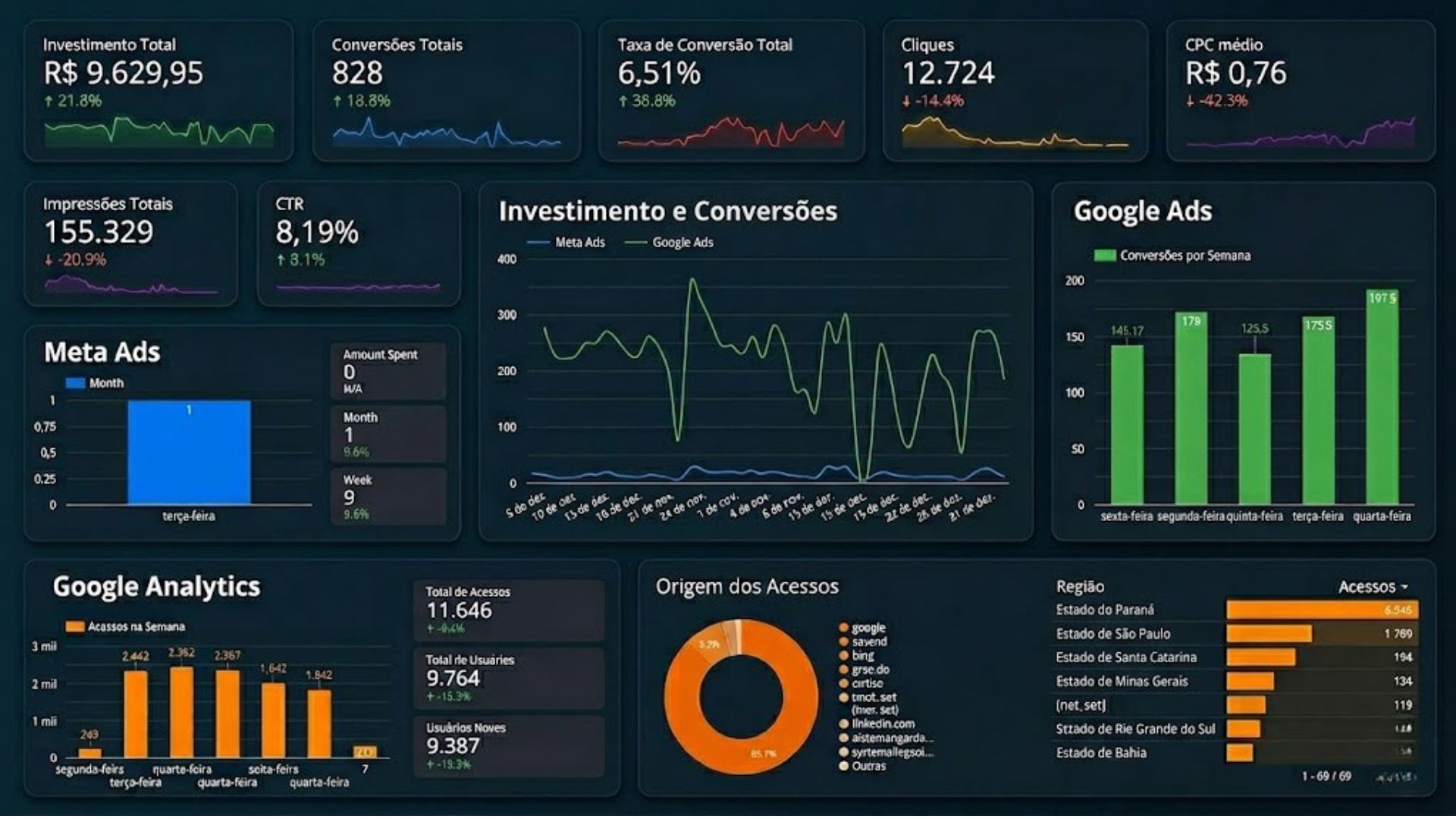 Dashboards em tempo real. Você sabe exatamente quanto está investindo e quanto está ganhando.